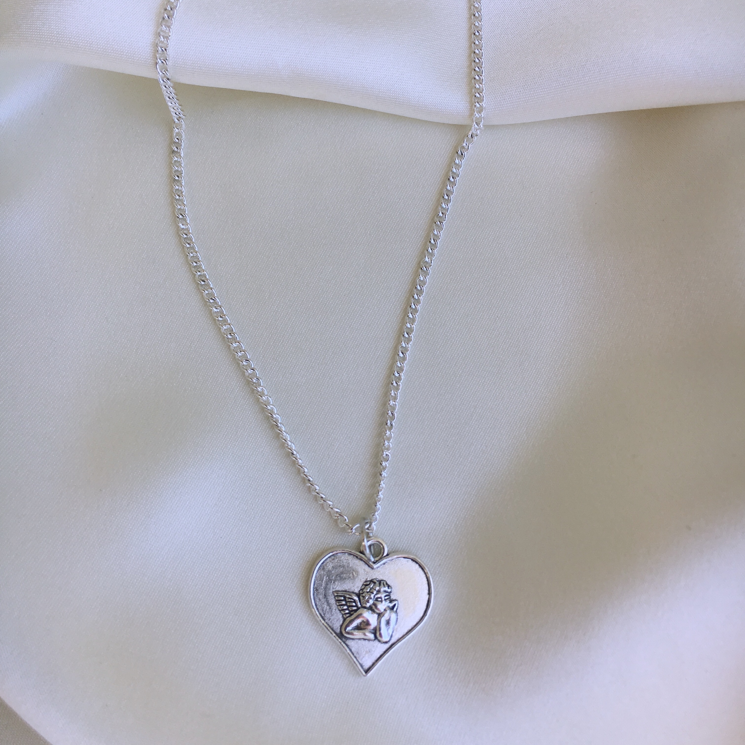 Heart shaped charm with a exquisite detailed cherub design. Your choice of 925 sterling silver curb link or rolo curb chain. 18 inches in length.