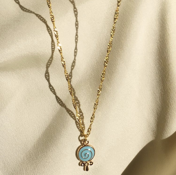 Yummy little lollipop charm sparkling with a blue swirl and gold bow adorned on a 18k gold filled water wave chain. 18 inches in length.