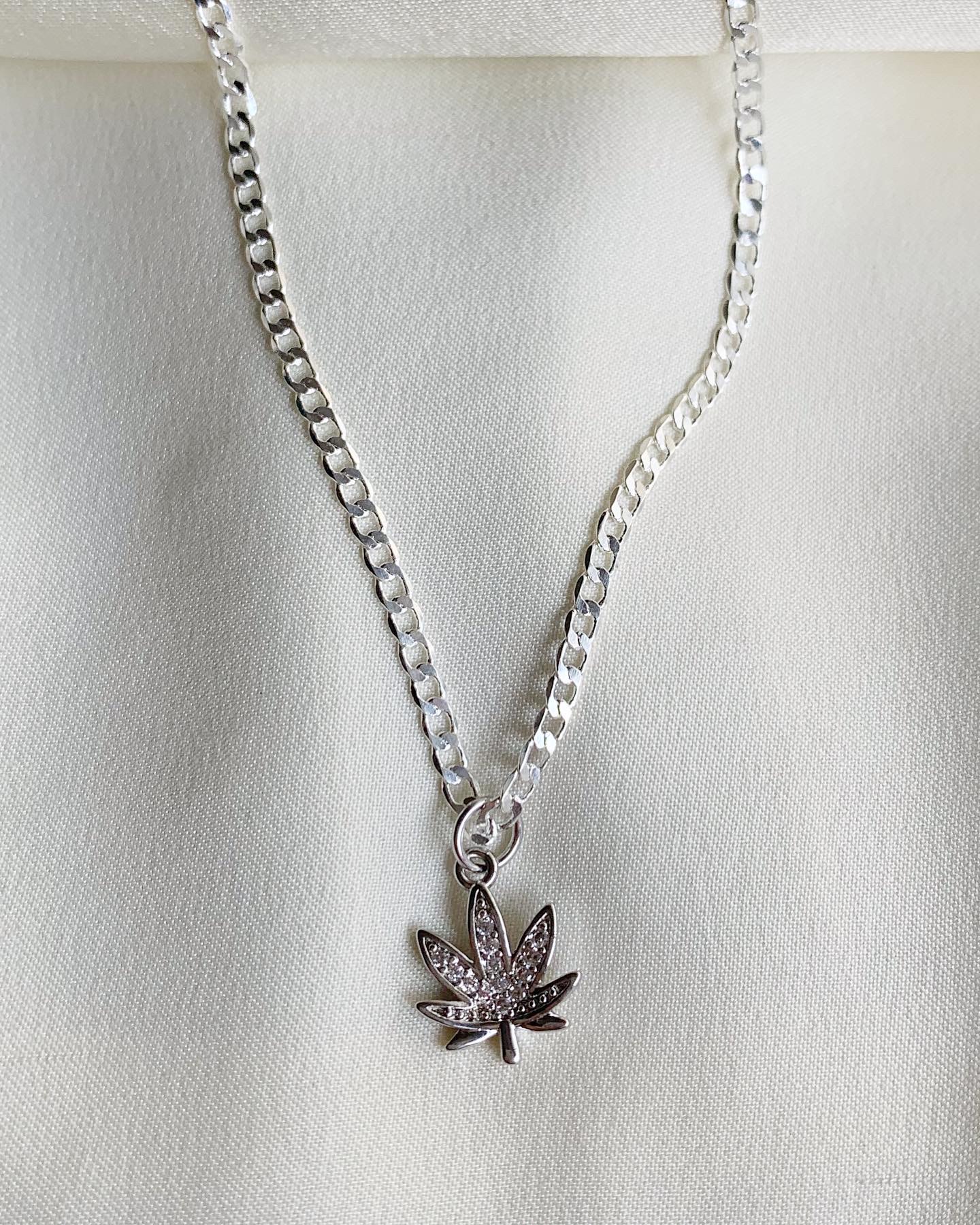 925 sterling silver maryjane leaf charm decorated with clear cz crystals. Adorned on your choice of 925 sterling silver chain. Necklaces are 18 inches in length.