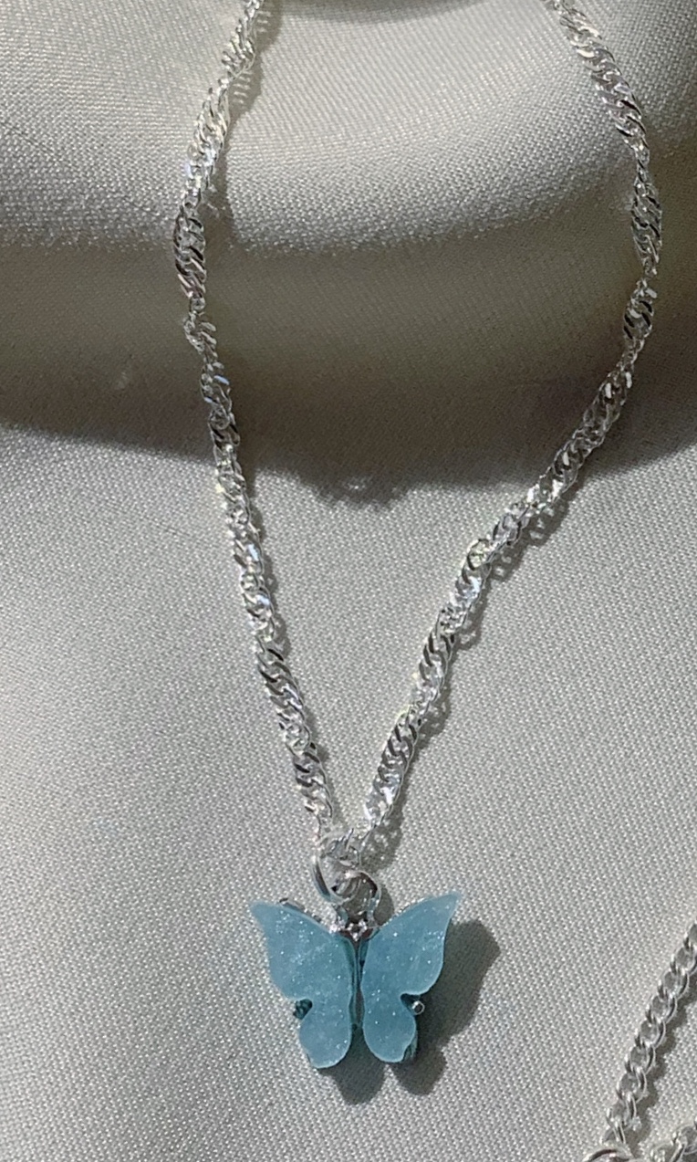 A sterling silver pendant charm with a light blue acrylic pearl butterfly. Your choice of rolo curb, water wave, Figaro chain, curb link, flat curb link or space ball chain.