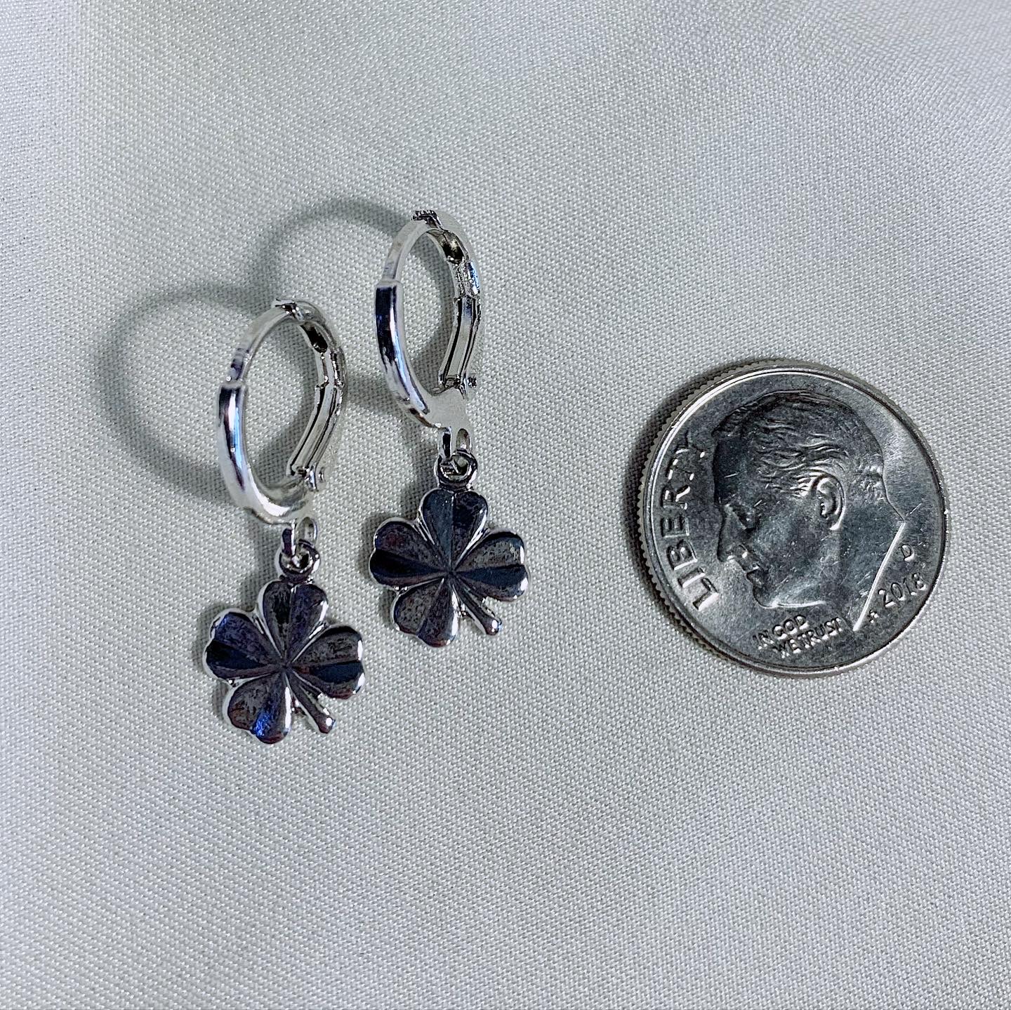 925 sterling silver small four leaf clover charm. Adorned on 925 sterling silver lever back earring hooks.
