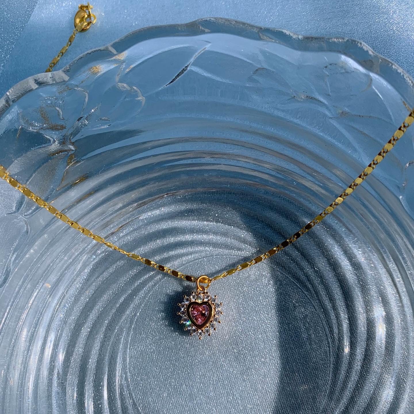 A dazzling heart charm made with clear and pink cz diamonds adorned on your choice of 14k gold filled water wave or rolo curb chain. Necklaces are 16 inches in length.