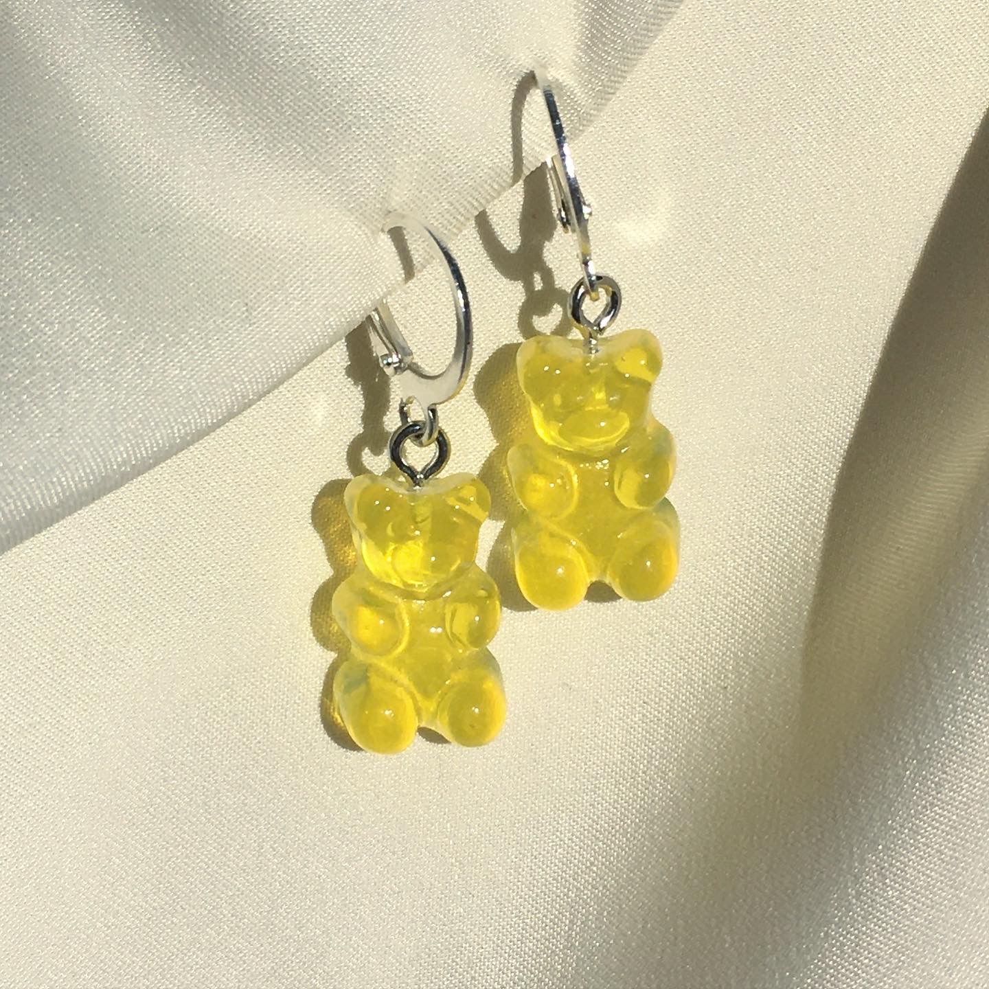 Your favorite gummy is now an earring. Cute little gummy bear earrings made from clear acrylic and adorned on 925 sterling silver leverback earring hooks for your comfiest fit. Your choice of orange, yellow, green, or light pink.