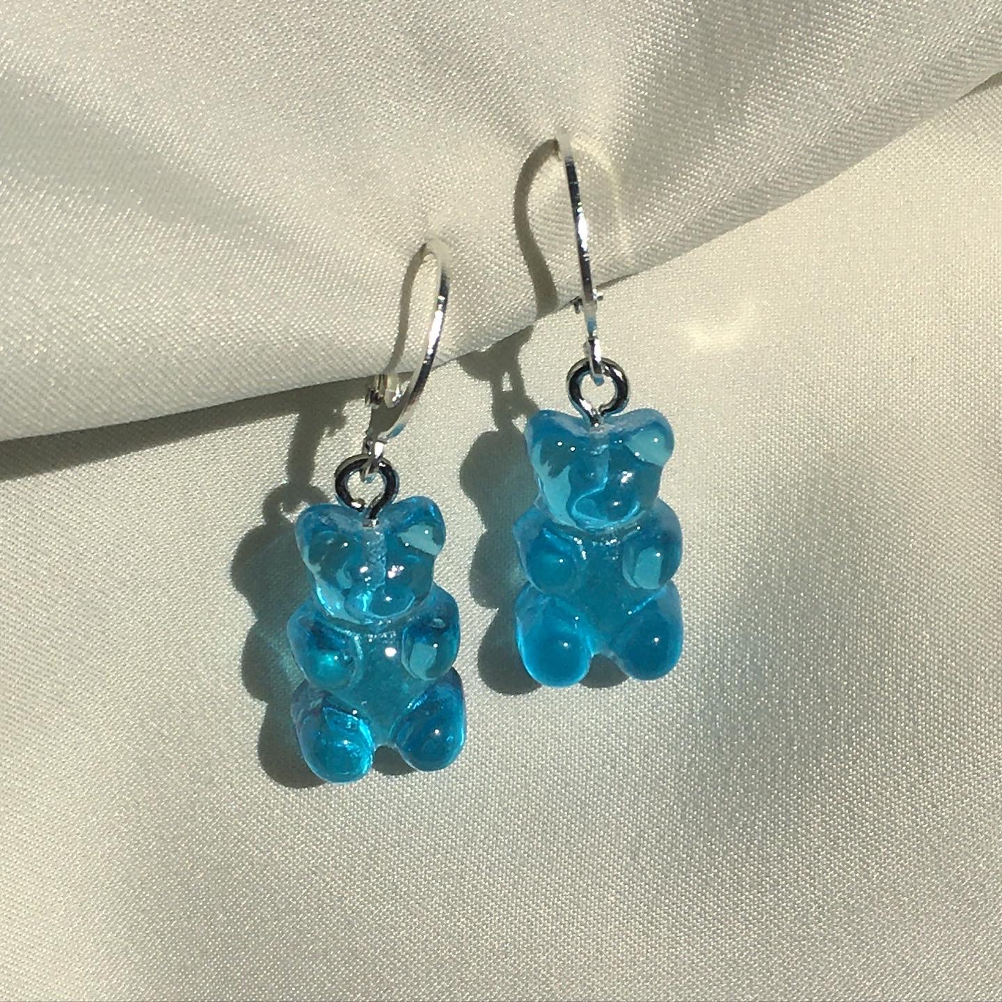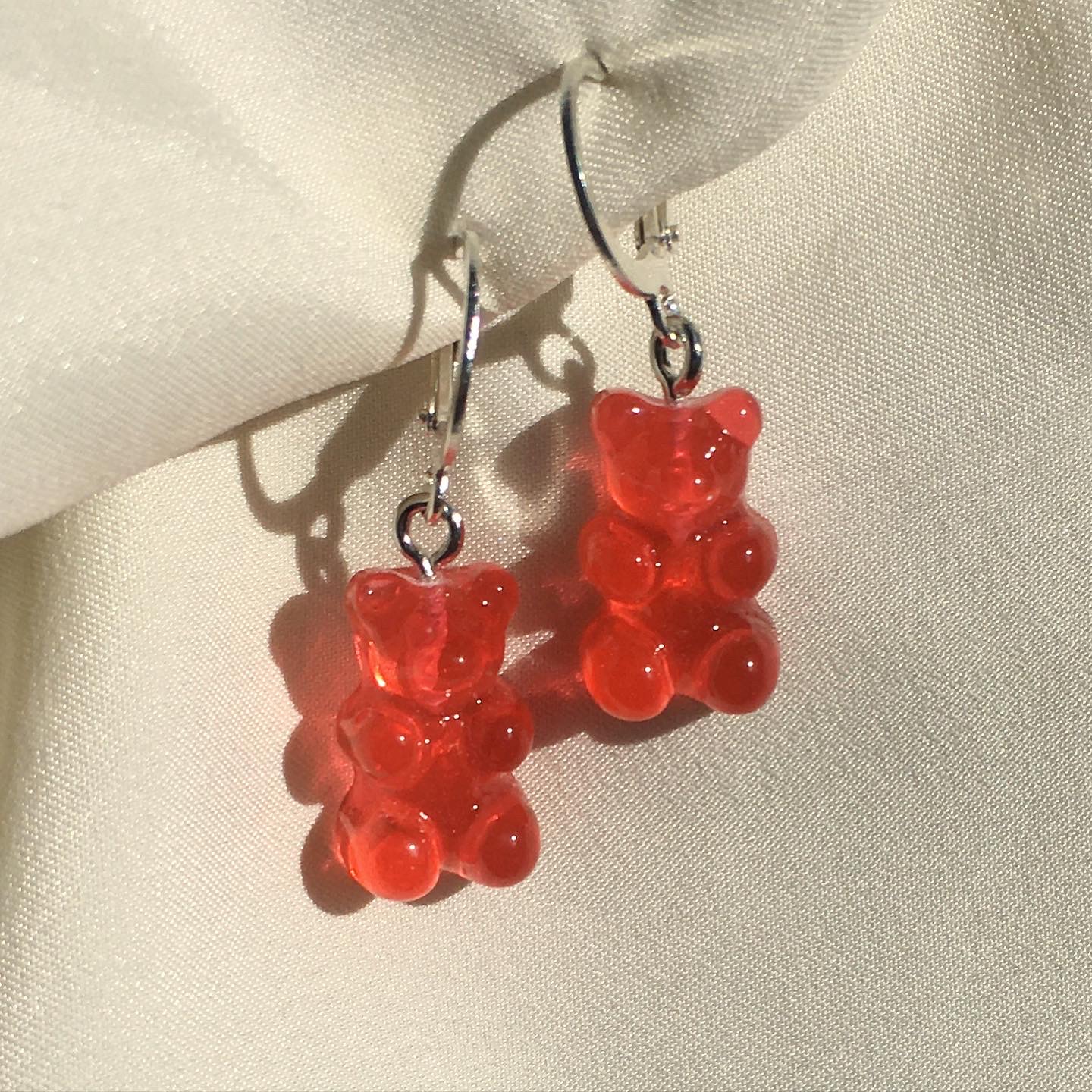 Your favorite gummy is now an earring. Cute little gummy bear earrings made from clear acrylic and adorned on 925 sterling silver leverback earring hooks for your comfiest fit. Your choice of red, bubblegum pink, purple or blue.