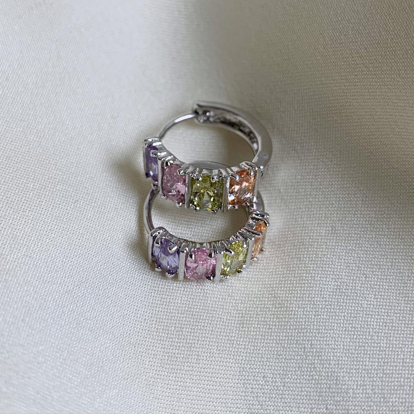 Mini hoop huggie earrings with four purple, pink, green and champagne colored cz crystals. Made from white 18k gold filled. -0.55 inches Please see FAQ for more information on metal and care instructions.