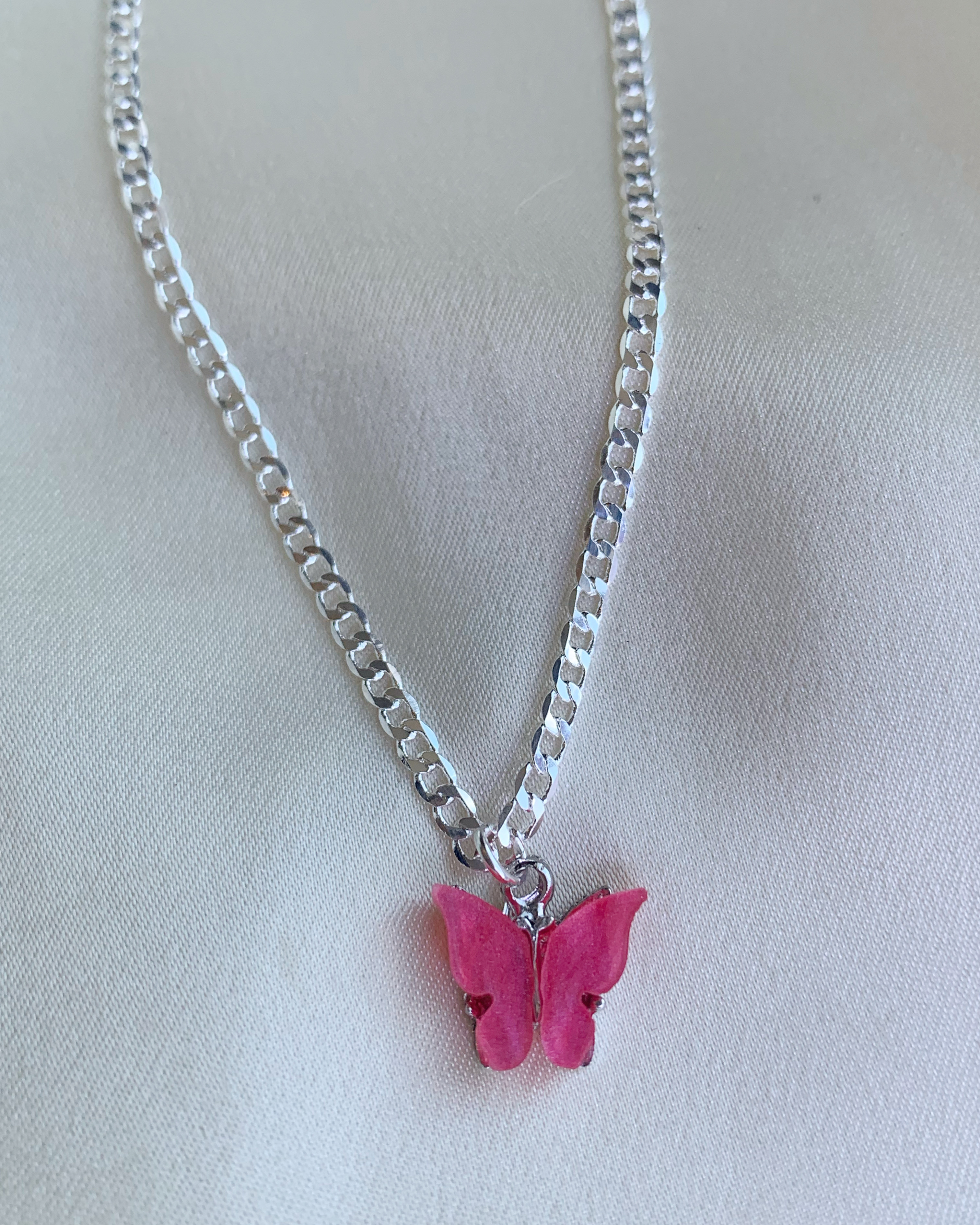 A sterling silver pendant charm with a hot pink acrylic pearl butterfly. Your choice of rolo curb, water wave, Figaro chain, curb link, flat curb link or space ball chain.