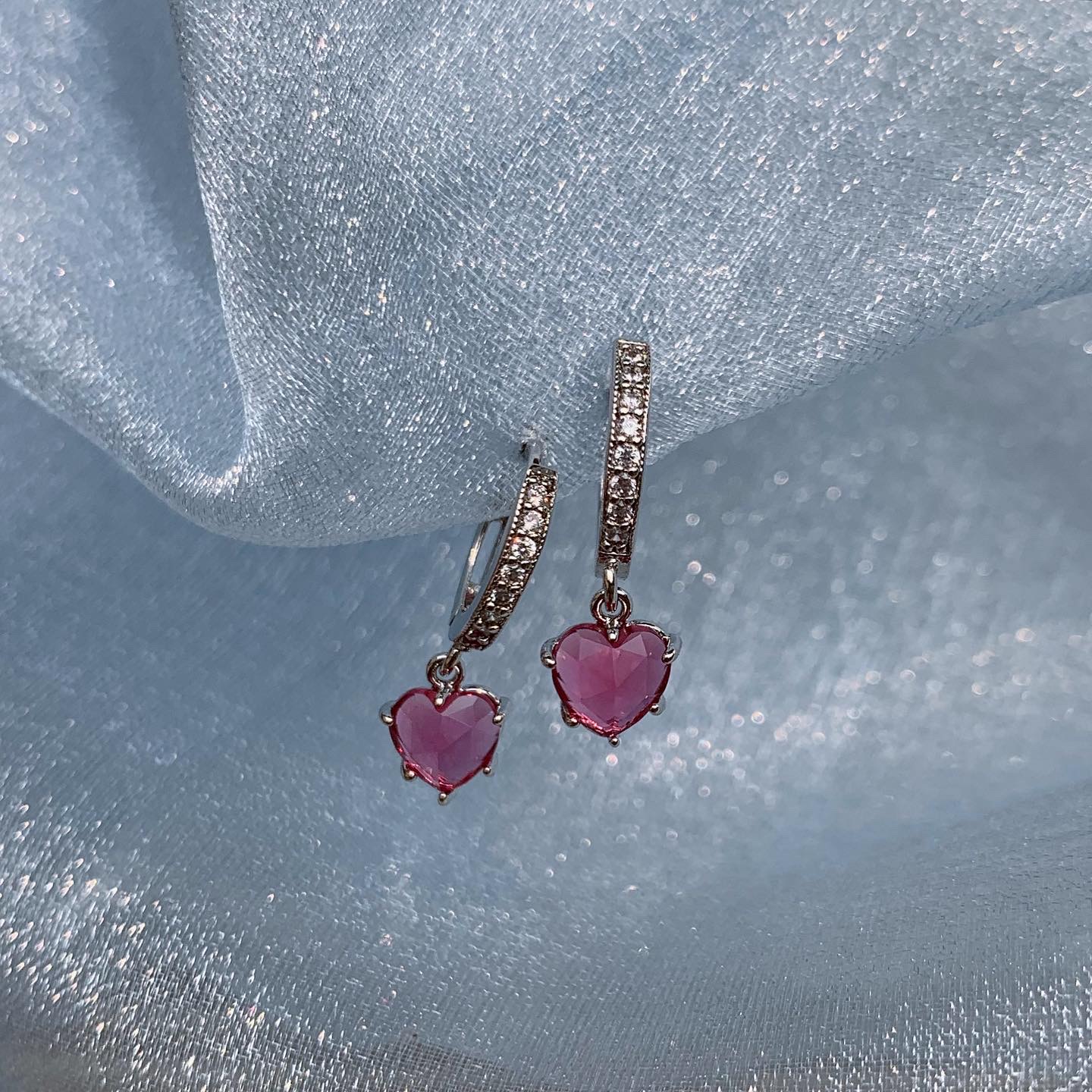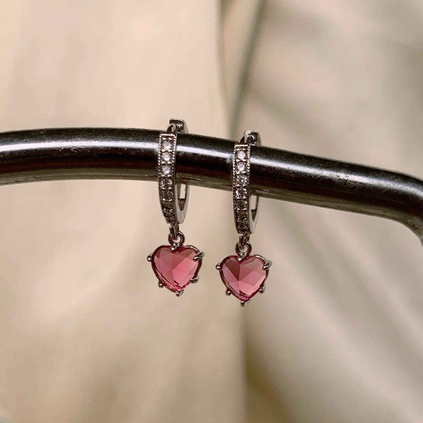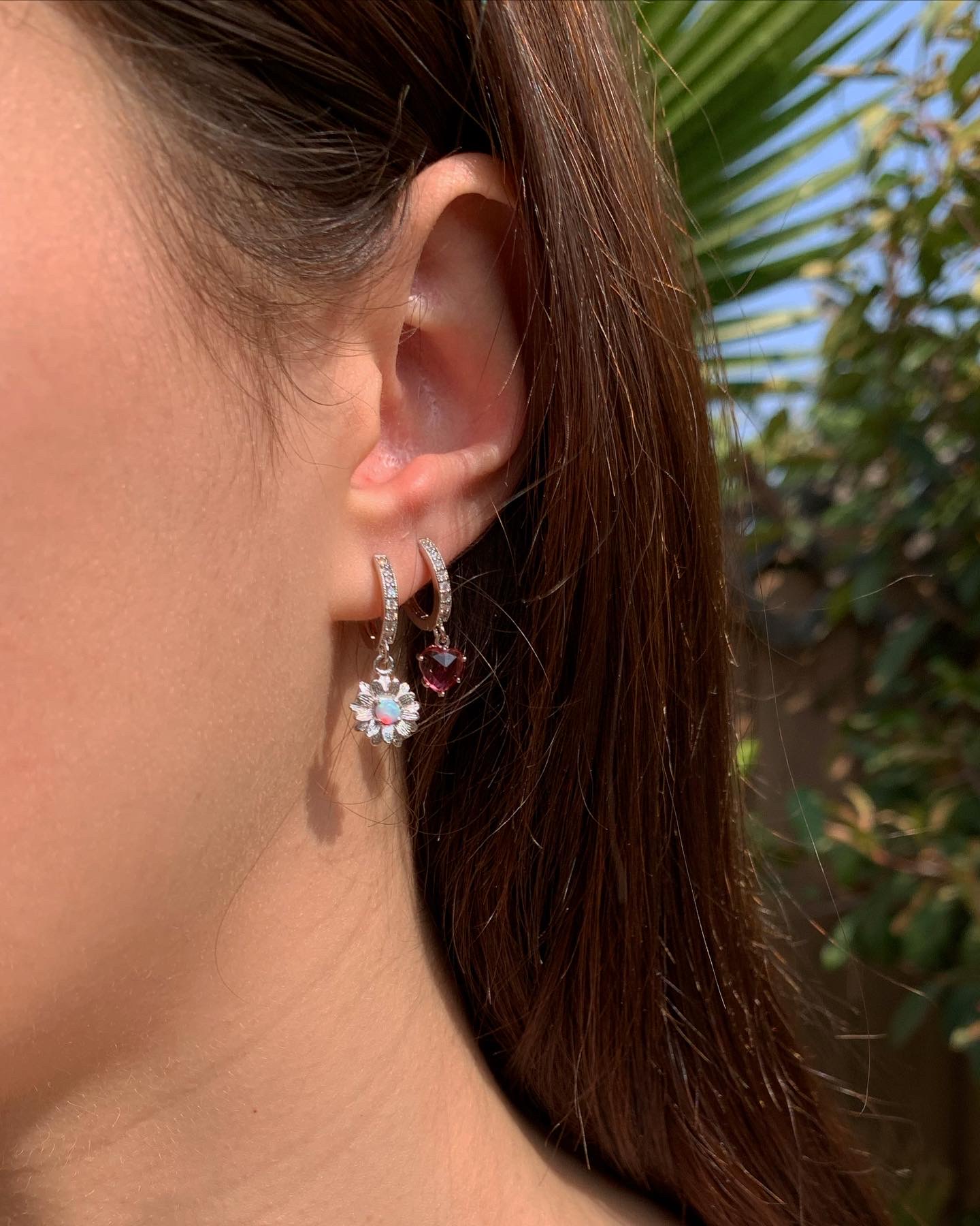 Mini hoop huggie lever back earrings aligned with clear cz crystals and a single clear light pink quartz charm.