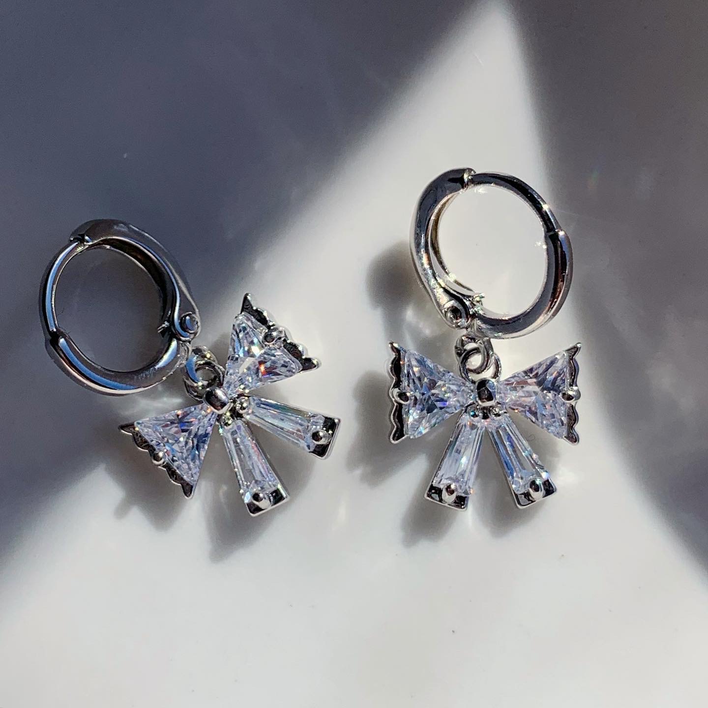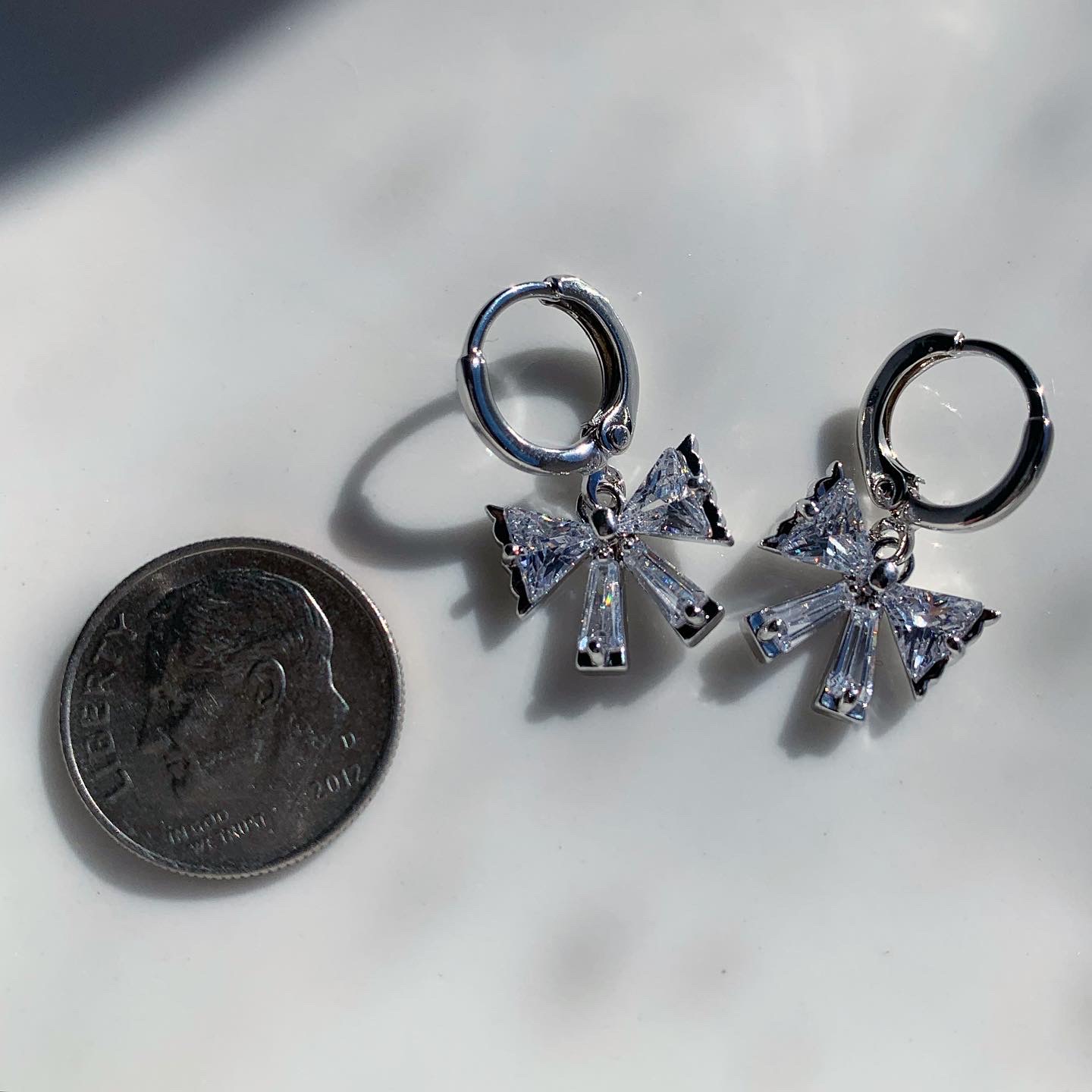 .925 sterling silver bow earrings. Aligned with cz crystal diamonds on leverback “huggie” hook/hoop earrings.