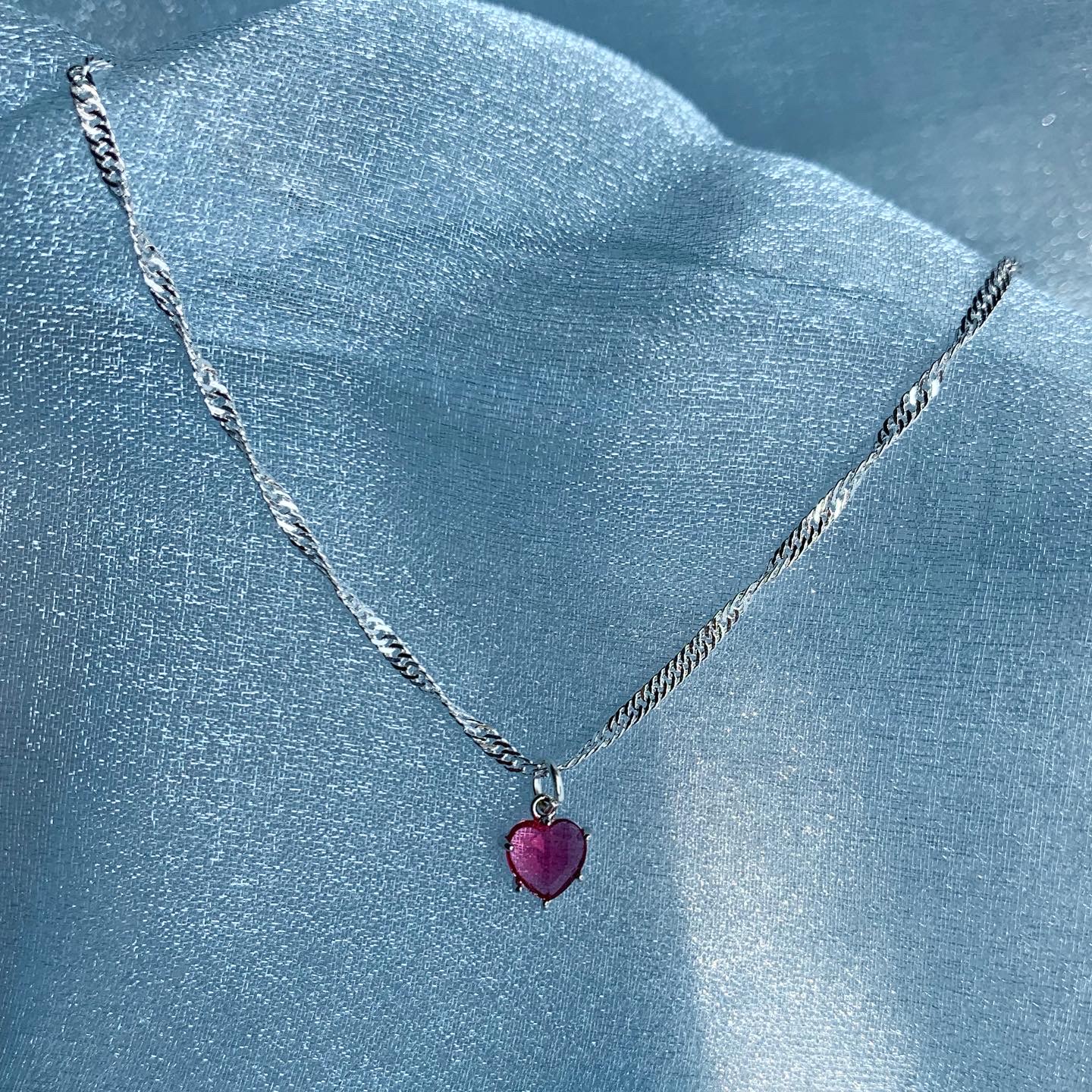 A sterling silver pendant charm with a heart shaped, clear light pink quartz charm. Your choice of rolo curb, water wave, Figaro chain, curb link, flat curb link or space ball chain.
