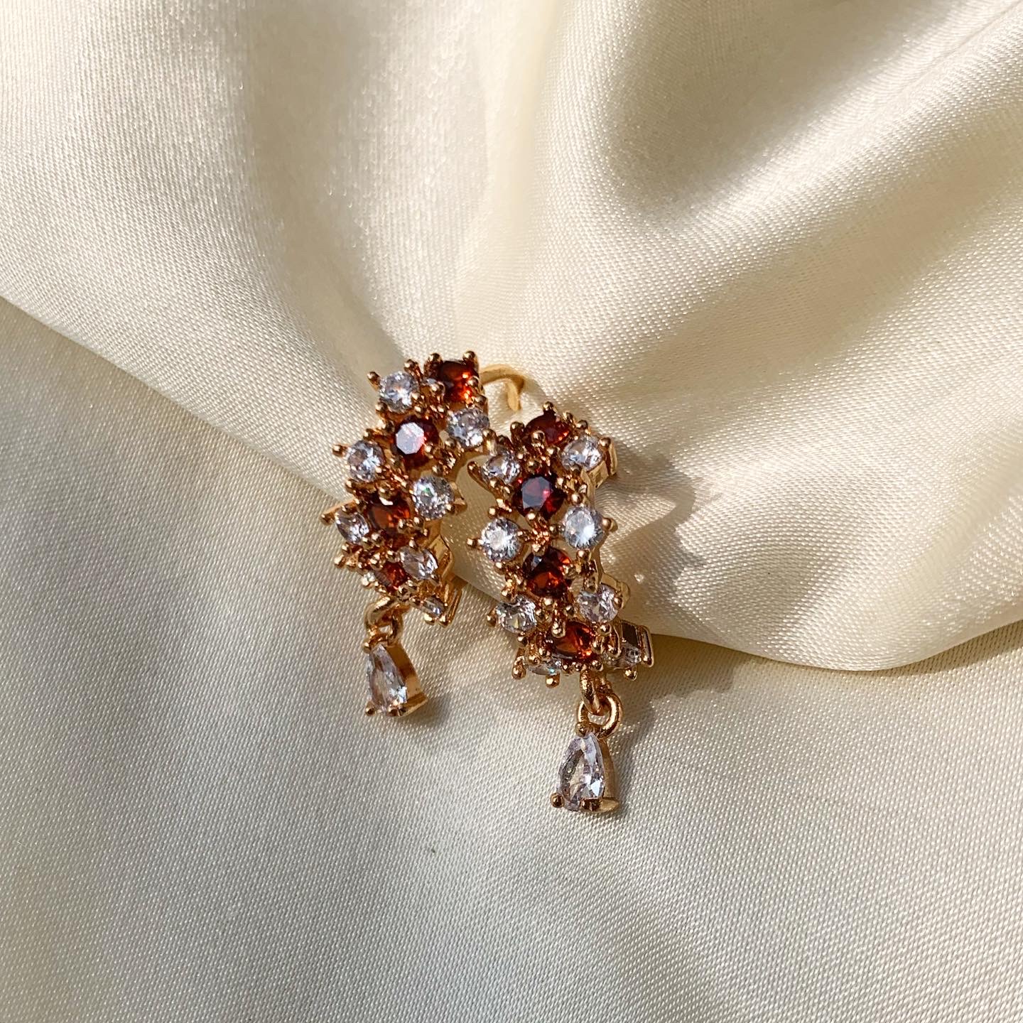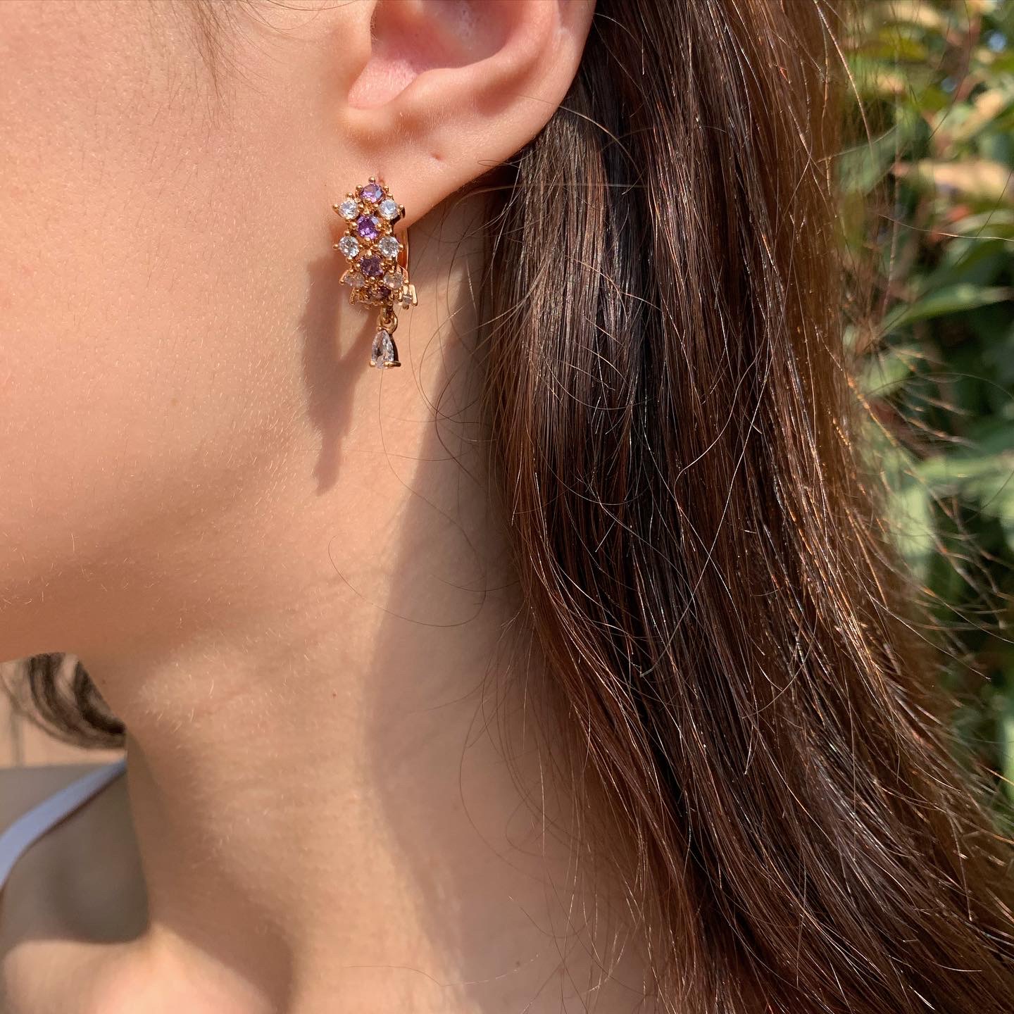 18k gold filled mini hoops with a clear cz charm. Aligned with clusters of emerald, ruby or amethyst purple. Adorned on lever back earring hoops. Hoop diameter: 0.47 inches
