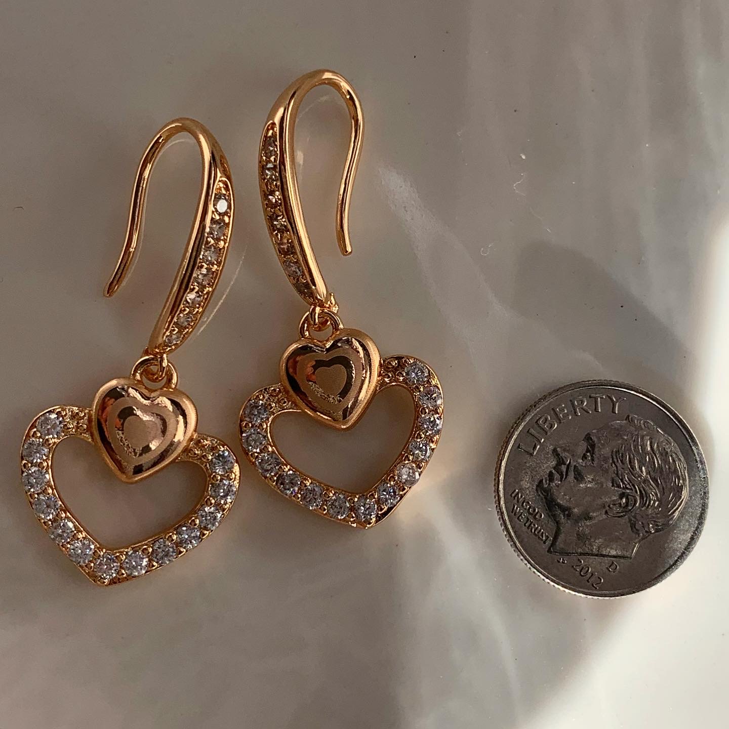 18k gold filled earrings with a heart charm aligned with cz crystal diamonds. Adorned fishhook earring hooks for your comfiest fit.